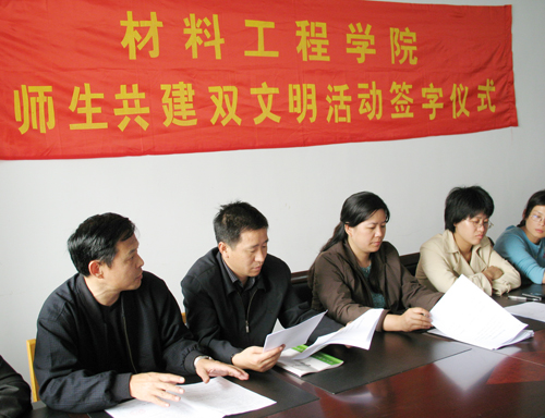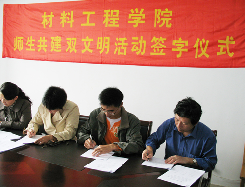 材料工程学院也在近日举行了“师生共建双文明”签字仪式。该院院长、党委书记贾俐俐要求师生共建双文明活动应紧紧围绕学校“评建创优”中心工作,努力营造全员育人的校园文化氛围,同时她还对共建双方如何真正将共建工作落到实处提出了具体的建议,对学院今后师生共建工作的开展提出了殷切的希望。