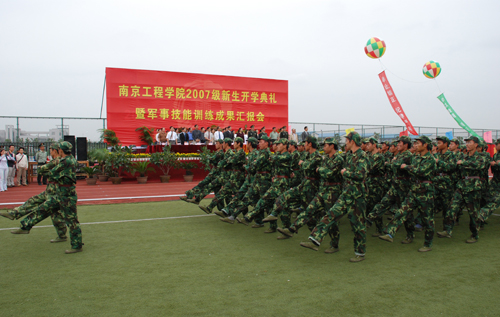 开学典礼后,军事技能训练成果汇报表演开始了。神采奕奕的新生们组成45个方阵接受学校领导和承训部队首长的检迈之后,迈着矫健的步伐依次通过主席台,气势如虹的精神面貌、振奋人心的嘹亮口号充分展示了他们蓬勃的青春朝气和热血沸腾的雄心壮志!接着,同学们还分别表演了女子擒敌拳、男子军体拳、男女混编军体拳,他们虎虎生威的表演赢得了大家热烈的掌声。