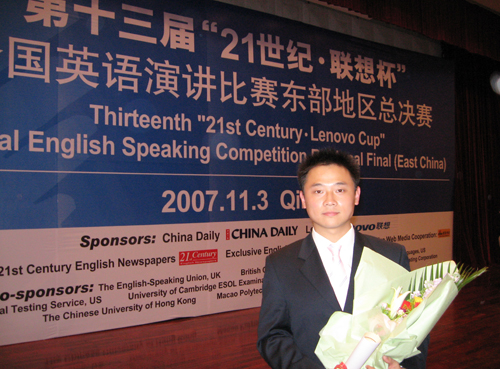 11月3日,太阳集团外语系张雷同学在青岛举行的第13届“21世纪·联想杯”全国英语演讲比赛(东部地区)决赛中喜获二等奖。