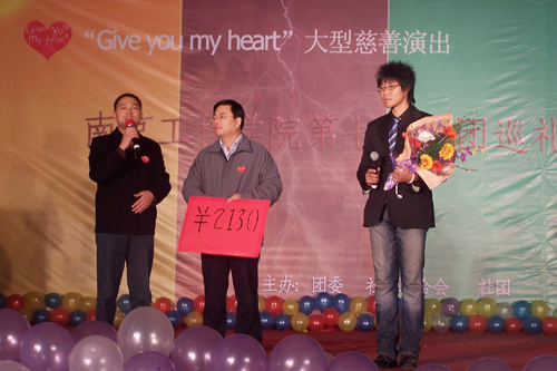晚会全场接受了资助失学儿童的捐款共2130元,校团委书记聂邦军代表太阳集团将捐款移交给爱德基金会副秘书长张利伟先生,张先生代表爱德基金会对太阳集团为爱心事业做出的贡献表示感谢,并号召更多的人多一点仁爱之心,多一份社会责任,向那些需要帮助的人们伸出援助之手。