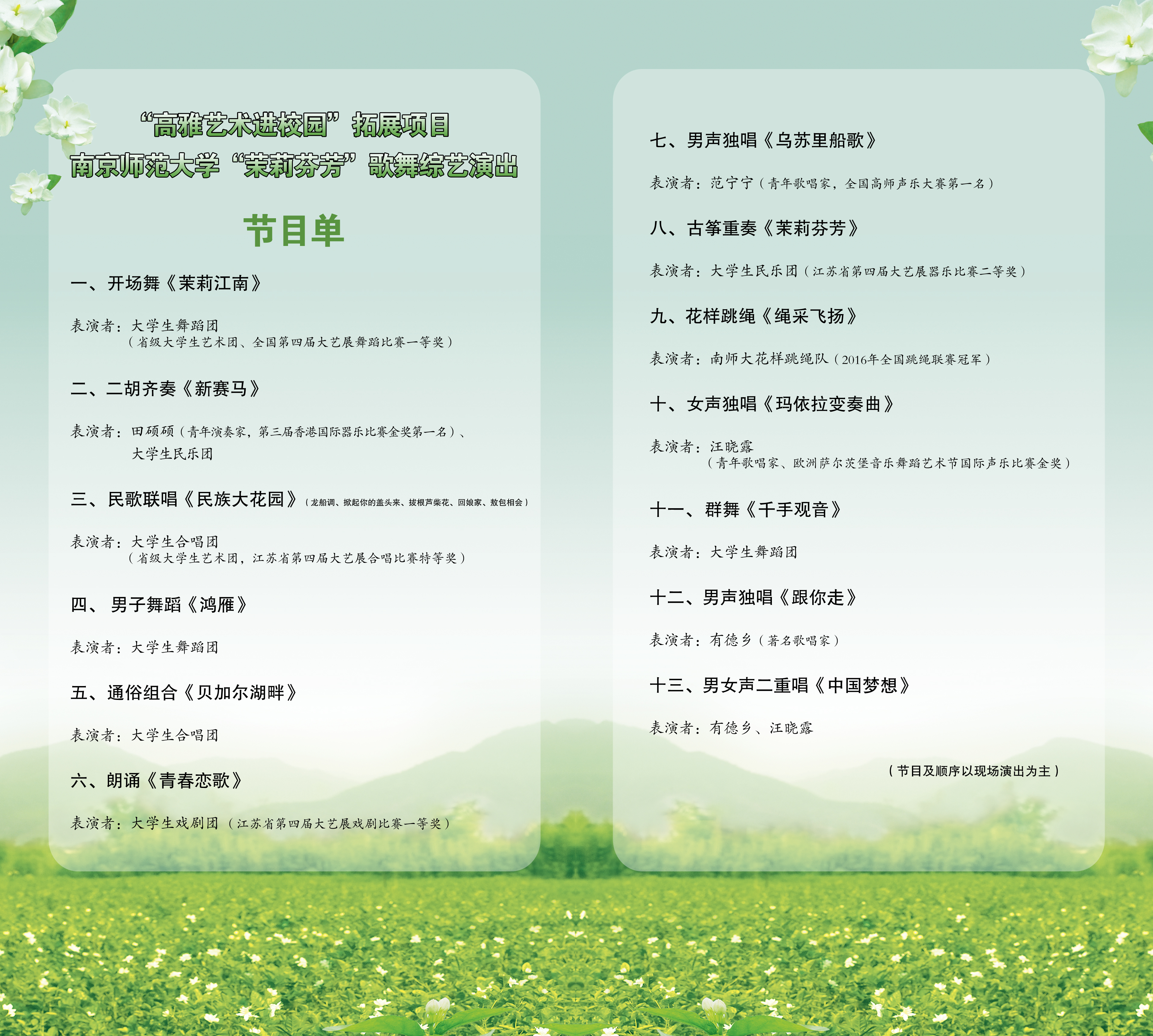 本次“高雅艺术进校园”是由南京师范大学大学生艺术教育中心给我们带来的“茉莉芬芳”歌舞综艺演出。演出本着“高水平、高层次”的宗旨,突出中国民族民间传统文化,以高雅艺术为展现形式,选取中国优秀艺术领域的经典作品,汇集了南京师范大学多年来艺术教育的优秀成果和艺术团历年在全国、全省获奖的经典节目,是一场集专业性、民族性、校园性于一体的文艺演出。本场演出,以中华民族音乐舞蹈为主线,既有流芳百世的艺苑精粹,又有充满青春气息和时代精神的佳品力作。晚会的表演形式丰富而多样,包括声乐、舞蹈、器乐、朗诵等,能充分满足观众的视听感受和对舞台美的欣赏需求。晚会的演员阵容强大,作为本次综艺演出的艺术指导均为在我省艺术表演领域中享有较高声誉的专家,他们分别为著名男高音歌唱家有德乡教授、著名二胡表演艺术家召唤老师、著名舞蹈编导李凯伟老师。参加演出的演员包括知名艺术家、南京师范大学艺术类专业教师、艺术团的指导教师以及获得过省内外重大奖项的学生演员和艺术特长生。晚会的部分节目已在全省各大高校及电视台进行过专场演出,受到了广大师生和观众的一致好评。