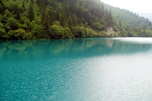 注:箭竹为大熊猫最喜食物,箭竹海湖岸四周广有生长,乃箭竹海之最特,故得其名。湖面开阔而绵长,水色碧蓝。倒影历历,直叫人分不清究竟是山入水中还是水浸山上。