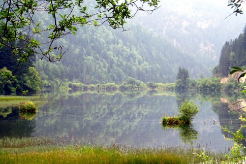 注:芳草海得名于修长湖面上之萋萋芳草。此处水面清幽宁静,浅浅芳草与其倒影相映成趣,间有水鸟悠游其间。游中恰遇毛毛细雨,冒雨游览,更是别具情趣。雨后天晴,风和日丽,海面蓝天白云、群峰倒映,恰一副绝美之湖草山水画。尤在风和日丽天,湖上蓝天白云,岸边花草相间,湖畔群峰静立,倒映水中,一片迷离景象。