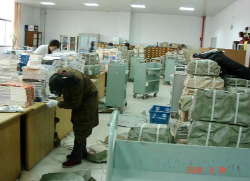 截至日前,搬迁的全部人员已苦战了8天,临时馆、新馆内均呈现出一片紧张有序的繁忙景象(如图)。同时,新图书馆楼内环境布置和美化工作也开始紧锣密鼓地进行,目前图书馆还在积极与其他部门协调图书馆网络系统、门禁系统的安装以及新购之办公家具、设备的到位工作。