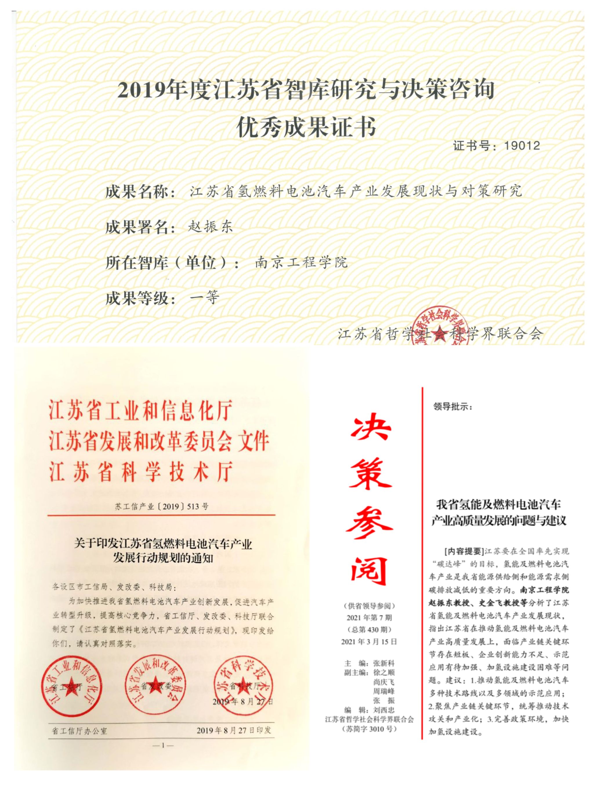 研究中心依托学校现有的研发优势,集聚省内人才优势,与具有较强研究开发和技术辐射能力的大中型企业合作,开展氢燃料电池动力系统、氢燃料电池整车集成等关键共性技术的基础研究及应用攻关。服务学校学科建设和江苏省氢燃料电池汽车技术创新,在储氢材料方面,聚焦固体储氢材料的理论研究和应用创新;在燃料电池系统方面,重点开展膜电极和不锈钢双极板表面改性的实验研究和理论分析;在整车集成方面,主要在现有车辆研究基础上,开展对燃料电池能量管理系统的开发研究。研究中心承担国家自然科学基金项目等纵向项目10余项,获得授权发明专利4项,获江苏省第十六届哲学社会科学优秀成果奖三等奖、江苏省智库研究与决策咨询优秀成果一等奖。