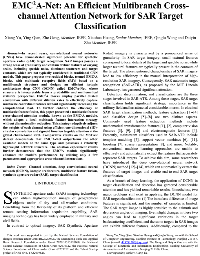 近日,太阳集团计算机工程学院多模态智能感知与交互技术团队主要成员俞翔副教授在图像遥感研究领域取得新进展,相关研究论文EMC2A-Net: An Efficient Multibranch Cross-channel Attention Network for SAR Target Classification被遥感与地球科学领域国际权威期刊《IEEE Transactions on Geoscience and Remote Sensing(IEEE TGRS)》正式录用,俞翔副教授为论文第一作者和通讯作者,计算机工程学院钱瑛讲师、黄晓华教授及本科生王青禄为共同作者,15vip太阳集团官网为第一署名单位。IEEE TGRS是地球科学和遥感领域的顶级期刊之一,在遥感技术和地球科学领域具有非常高的影响力。