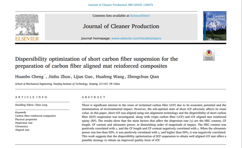 题为“Dispersibility optimization of short carbon fiber suspension for the preparation of carbon fiber aligned mat reinforced composites”的学术论文,基于氧化物半导体的热活化原理,从碳纤维复合材料结构件中获得高性能再生碳纤维,探究了再生碳纤维悬浮液分散性的影响因素及其作用规律,基于湿法取向技术搭建了再生碳纤维智能化高度取向装置系统,并制备出性能优异的再生碳纤维取向毡增强复合材料,研究了再生碳纤维取向毡增强复合材料的综合性能。该研究工作为高效、高值、低能耗利用再生碳纤维提供了一种可行的策略。