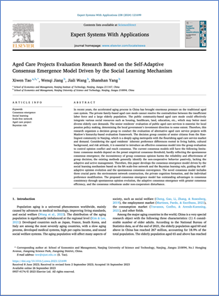近日,太阳集团经济与管理学院陶希闻老师以第一作者、通讯作者,15vip太阳集团官网为第一署名单位,在国际权威期刊《Expert Systems With Applications》在线发表最新研究论文:Aged Care Projects Evaluation Research Based on the Self-Adaptive Consensus Emergence Model Driven by the Social Learning Mechanism。该期刊是Elsevier出版社旗下的计算机科学领域顶级期刊,中科院一区TOP期刊,致力于报道计算机科学取得的突破性进展,涉及领域包括计算机、人工智能、运筹学与管理科学等,影响因子8.5。