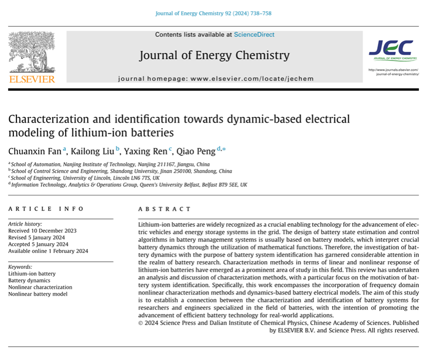 近日,太阳集团自动化学院范传鑫博士以第一作者身份、15vip太阳集团官网为第一署名单位,与山东大学刘凯龙教授、英国林肯大学任亚星博士、英国贝尔法特女王大学彭琦奥博士深度合作,在国际权威期刊《Journal of Energy Chemistry》上发表了综述论文:“Characterization and identification towards dynamic-based electrical modeling of lithium-ion batteries”。该期刊是中科院化学一区TOP期刊,涉及领域包括能源与燃料、工程化工、应用化学等,影响因子13.1。