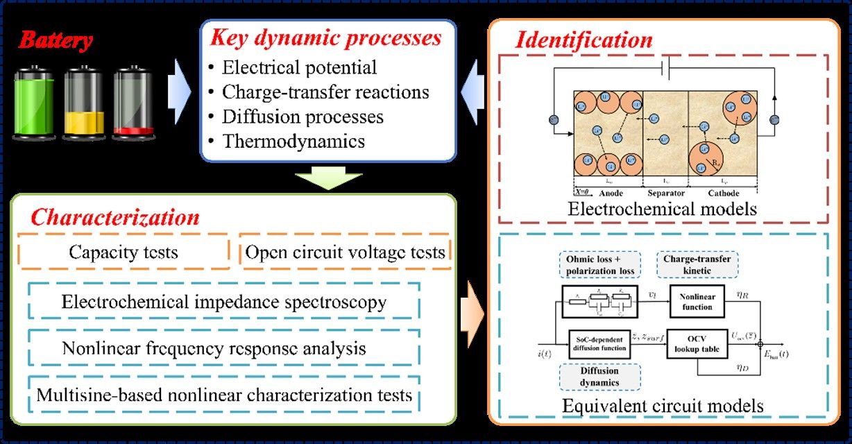 锂离子电池被广泛认为是推动电动汽车和电网储能系统发展的关键技术。电池管理系统中电池状态估计和控制算法的设计通常基于电池数学模型,并通过使用数学关系函数解释关键的电池动态行为。因此,以电池系统辨识为目的的电池动态研究在电池研究领域引起了广泛关注。锂离子电池线性和非线性动态响应的原位表征方法已成为该领域的一个重要研究方向。该综述对现有锂电池领域中的原位表征测试方法进行了分析和讨论,尤其侧重于在锂电池系统辨识建模方面的应用。该工作从现象学的角度将锂电池主要电化学动态进行分类,并根据电池线性与非线性动态响应将包括非线性表征方法在内的时域、频域表征测试方法进行总结。将各种性能测试方法与其对应的基于电池动态的现存锂电池数学模型进行关联,明确了电化学模型和等效电路模型等电池数学模型构建所需的相关性能测试方法,建立了零均值多频正弦非线性原位表征方法与系统辨识的理论体系。该研究的目的是为电池领域的专业研究人员和工程师建立电池表征测试与系统辨识建模之间的桥梁,以促进实际应用中高效电池技术的发展。