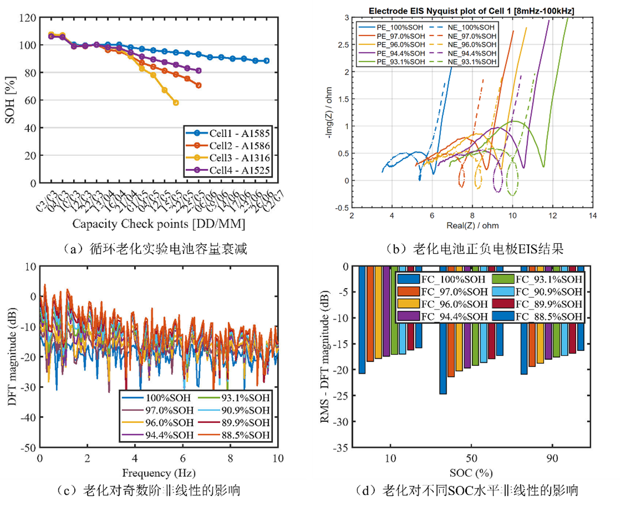 近来,锂离子电池的非线性动态响应问题在电池表征和健康诊断领域受到高度关注。零均值多频正弦激励测试作为一种新兴的电池非线性原位表征方法,已被证实可用于获取锂电池的阻抗与电化学行为信息,并且该方法具有车载应用的发展潜力。在该研究工作中,对三电极实验电池进行了常温低电流倍率充放电循环老化实验、参考检测实验(包括容量检测及电化学阻抗谱测试)、以及零均值多频正弦非线性表征测试实验,以研究容量衰减对电池非线性响应的影响。通过记录容量衰减以确定各电池的健康状态,并基于电化学阻抗谱的测试数据研究锂电池的正、负电极随电池老化的阻抗变化以及老化机理。最后,通过对于锂电池奇、偶数阶非线性的分析确定电池容量衰减与稳态下非线性响应的相关性。从非线性表征数据中可初步看出的电池老化与其非线性响应之间具有一定的相关性,这与现有文献中非线性响应分析方法的研究结果一致。基于零均值多频正弦激励的方法具有同时捕捉阻抗相关信息和非线性信息的优势,这使得该方法可作为一种快速诊断方法在新能源汽车电池管理系统中部署以量化电池老化衰减程度,从而有助于优化动力电池管理与控制。