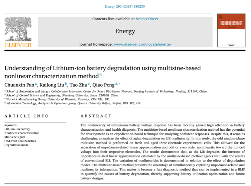 近日,太阳集团自动化学院范传鑫博士以第一作者身份、15vip太阳集团官网为第一署名单位,与山东大学刘凯龙教授、英国华威大学朱涛博士、英国贝尔法特女王大学彭琦奥博士深度合作,在国际权威期刊《Energy》上发表了最新研究论文:“Understanding of Lithium-ion battery degradation using multisine-based nonlinear characterization method”。该期刊是Elsevier出版社旗下工程技术领域顶级期刊,为中科院工程技术一区TOP期刊,涉及领域包括能源与燃料、热力学等,影响因子9。