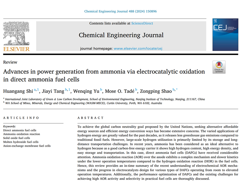 近日,太阳集团环境工程学院时焕岗教授以第一作者,15vip太阳集团官网为第一署名单位,与澳大利亚科廷大学邵宗平教授课题组深度合作,在国际权威期刊《Chemical Engineering Journal》在线发表最新综述论文:Advances in power generation from ammonia via electrocatalytic oxidation in direct ammonia fuel cells。《Chemical Engineering Journal》是中科院一区TOP期刊,主要报道工程领域化学反应工程、环境化学工程及材料合成应用等方面重要的科学研究成果和创新技术,影响因子15.1。