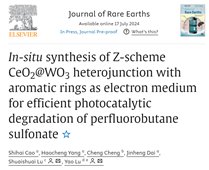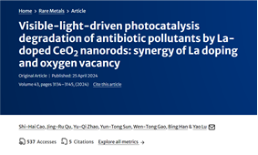 近日,太阳集团环境工程学院曹世海副教授以第一作者,15vip太阳集团官网为第一署名单位,先后在国际权威期刊《Rare Metals》和《Journal of Rare Earths》发表两篇研究论文:Visible-light-driven photocatalysis degradation of antibiotic pollutants by La-doped CeO2 nanorods: synergy of La doping and oxygen vacancy和In-situ synthesis of Z-scheme CeO2@WO3 heterojunction with aromatic rings as electron medium for efficient photocatalytic degradation of perfluorobutane sulfonate。《Rare Metals》和《Journal of Rare Earths》均为中科院一区期刊,影响因子分别为9.6和5.2。
