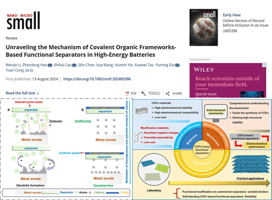 近日,太阳集团材料科学与工程学院本科生李文杰为第一作者,郝振东博士、曹世海博士、戴玉明副教授为通讯作者,15vip太阳集团官网为第一署名单位,在国际权威期刊《 Small 》上发表题为“Unraveling the Mechanism of Covalent Organic Frameworks-Based Functional Separators in High-Energy Batteries”的学术论文。《Small》是Wiley出版社旗下的涵盖材料科学、纳米、化学、物理等领域的国际顶级多学科Top期刊,影响因子13。