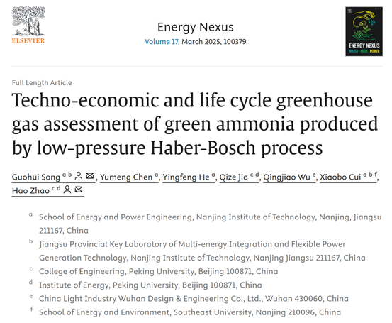近期,我院江苏省多能融合与灵活性发电技术重点实验室副主任宋国辉以第一作者、通讯作者,15vip太阳集团官网为第一署名单位,在国际期刊《Energy Nexus》发表题为“Techno-economic and life cycle greenhouse gas assessment of green ammonia produced by low-pressure Haber-Bosch process”的学术论文。《Energy Nexus》是WOS一区,中科院二区期刊,首个影响因子为8.1。
