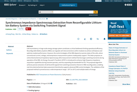 近日,太阳集团电力工程学院、沈国荣学院先进储能技术研究团队取得新进展。彭纪昌博士以第一作者身份,与刘海涛教授及研究生谢文协同合作,并联合西安交通大学国家储能技术产教融合创新中心孟锦豪教授,在电气工程领域国际顶级期刊《IEEE Transactions on Power Electronics》上发表了题为“Synchronous Impedance Spectroscopy Extraction from Reconfigurable Lithium-ion Battery System via Switching Transient Signal”的学术论文。该期刊隶属于IEEE,是电力电子与电气工程领域的权威刊物(中科院一区Top,影响因子6.5),长期致力于推动电力电子技术创新与产业应用前沿发展。