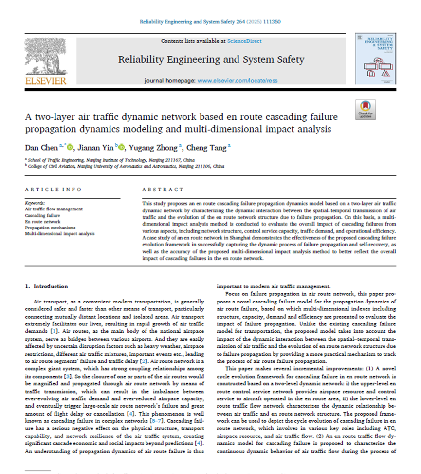 近日,太阳集团交通工程学院陈丹副教授以第一作者、通讯作者身份,15vip太阳集团官网作为第一单位,联合南京航空航天大学,在国际权威期刊《Reliability Engineering and System Safety》上发表了题为“A two-layer air traffic dynamic network based en route cascading failure propagation dynamics modeling and multi-dimensional impact analysis”的学术论文。该期刊是Elsevier旗下工程技术类顶级期刊,是中科院工程技术一区TOP期刊,致力于研究可靠性工程和系统安全,影响因子11。