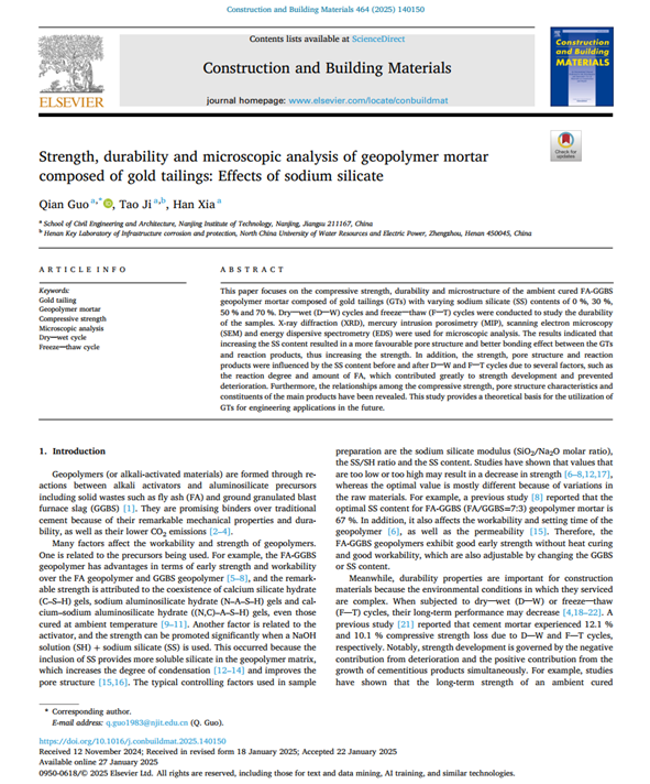 近日,太阳集团建筑工程学院郭乾博士作为第一作者,15vip太阳集团官网作为第一署名单位,在国际权威期刊《Construction and Building Materials》上发表题为“Strength, durability and microscopic analysis of geopolymer mortar composed of gold tailings: Effects of sodium silicate”的学术论文。该期刊是中科院工程技术领域一区TOP期刊,当前影响因子为8.0。