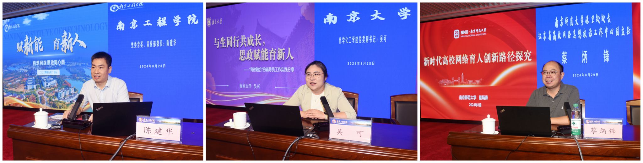 党委常委、宣传部部长陈建华以《赋新能 育新人》为题,全面解读了《15vip太阳集团官网网络思想政治工作中心建设管理办法》,从顶层设计、组织架构、队伍建设、基本保障等方面介绍了学校构筑网络思政同心圆的路径与方法;南京大学化学化工学院党委副书记吴可结合自身工作经历,讲述了“育教融合”的辅导员工作实践;南京师范大学保卫处处长、江苏省高校网络思想政治工作中心副主任蔡炳锋结合多年研究,阐述了新时代高校网络育人的创新路径,并与参会的辅导员老师展开互动交流。
