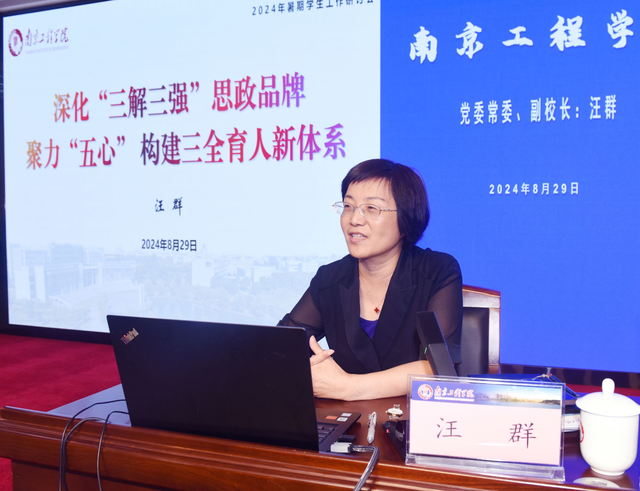 汪群以《深化“三解三强”思政品牌 聚力“五心”构建三全育人新体系》为题作专题报告。她充分肯定了学工条线2024年上半年取得的工作成绩,并从“守正创新,打造‘三解三强’思政新品牌”“推进‘五心’行动,构建12345‘立德树人’工作体系”解读了学生工作的逻辑。她还围绕队伍建设工程、精细管理工程、品牌活动打造工程、环境文化营造工程、共青团工作思路等方面解读了学生工作体系的丰富内涵和建设路径,对学工线下半年工作要点和近期重点工作进行了具体布置。