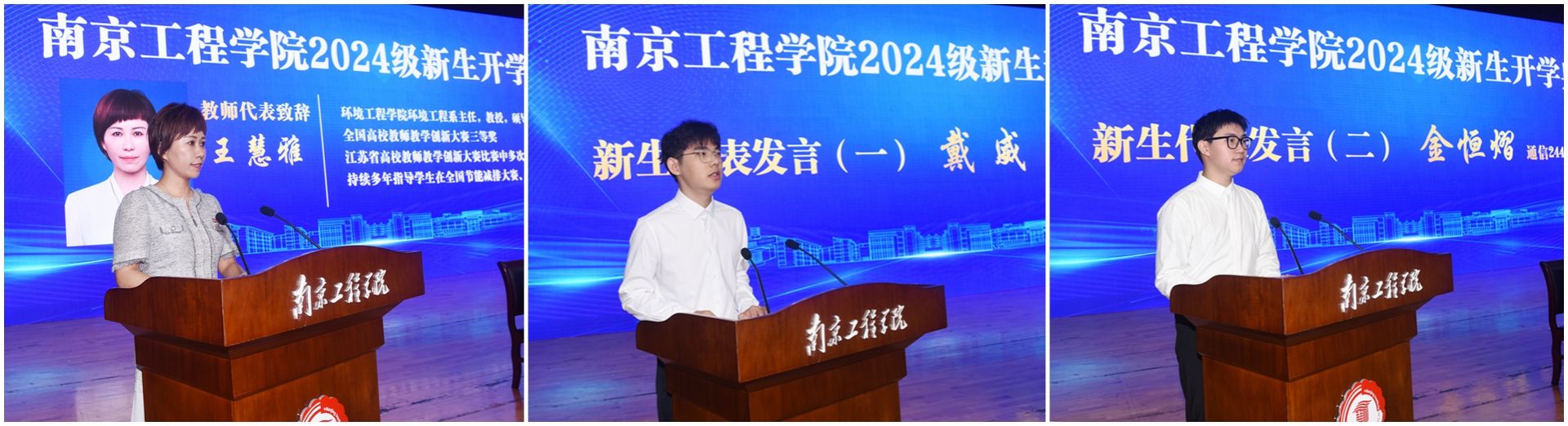 教师代表、环境工程学院王慧雅对2024级新同学表示热烈欢迎,并结合自身经历和执教经验,勉励新生珍惜时光、勤奋学习,勇于尝试、敢于挑战,保持好奇心、拥抱变化,以昂扬奋进的姿态,书写无愧于时代的壮丽篇章。研究生新生代表、电气工程研2408班戴威和本科生新生代表、通信工程244班金恒熠在发言中表示,将坚定理想信念,响应时代呼声,勇于成为知识的探索者、创新者和实践者,为实现中华民族伟大复兴的中国梦贡献青春力量。