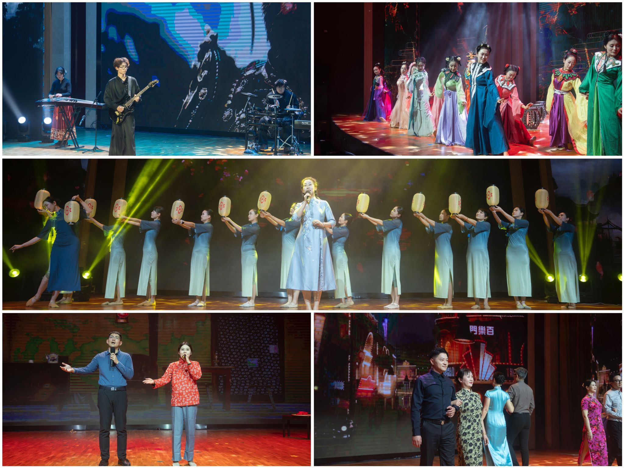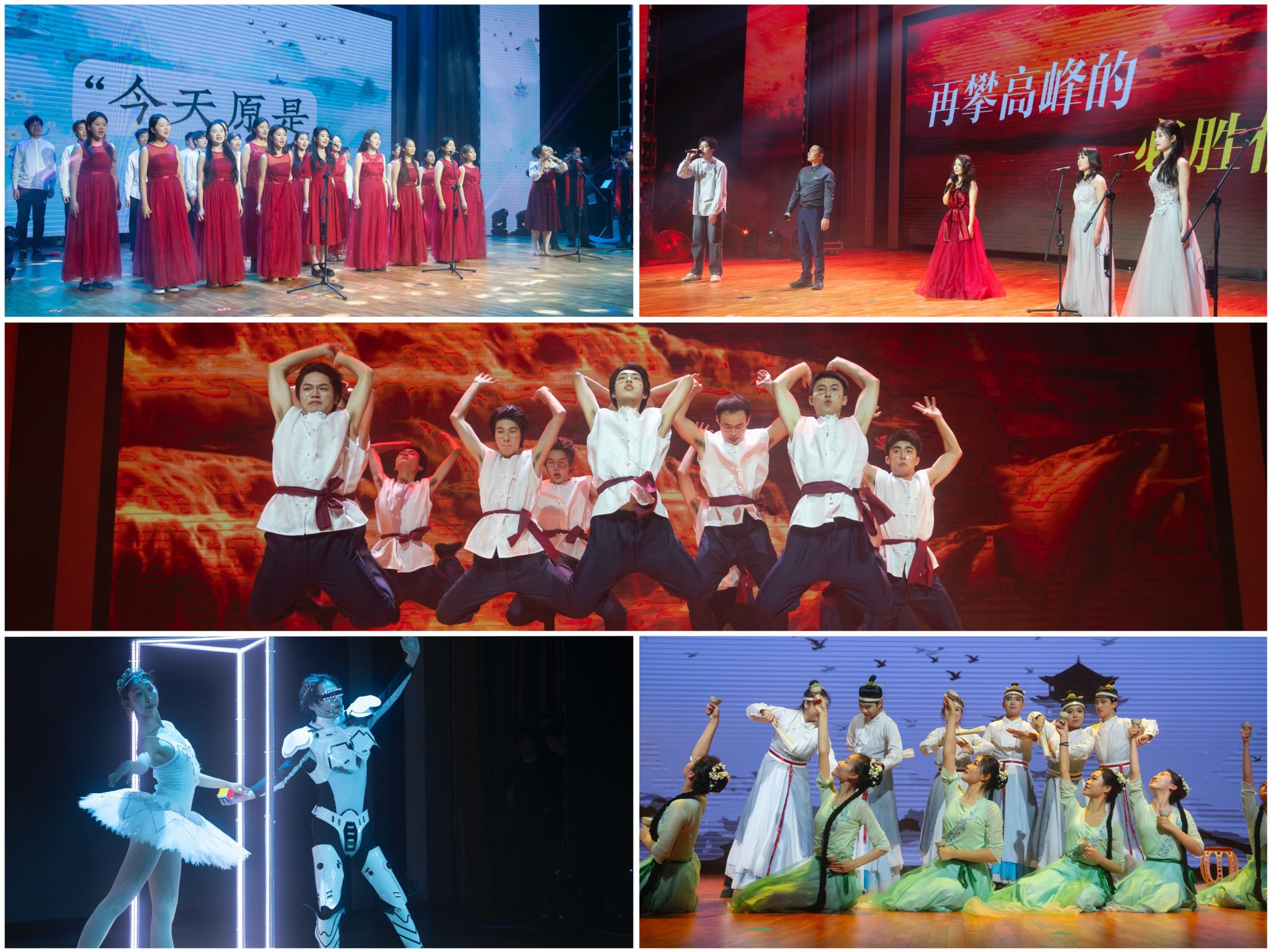 师生员工自编自演的节目也精彩上演。多种器乐演奏的《云宫迅音》将柔美的传统民乐与激昂的现代流行乐交融,把大家带入儿时的记忆;舞蹈《游园》《雅叙》演绎出古典与现代交织的优雅;戏曲《红灯戏》、舞蹈诗朗诵《从前慢》、旗袍秀《花样年华》从不同角度、以多种形式展现了中华优秀传统文化的魅力;竹笛合唱《上春山》、武术《大河之子》、表演唱《矢志登峰鸿鹄志》或婉转轻快,或气势磅礴,展现着南工程人的坚定、勇气和矢志登峰的燃情信念;表演秀《Code NJIT:人机共舞》通过人机共同表演的形式,带领大家共同感受艺术与科技,人与人工智能的碰撞与对话。演出在离退休老同志带来的红歌联唱中进入尾声,歌声唱出了对华夏大地的深情和热爱,抒发着师生们奋进登攀、共赴卓越的决心,激励着大家为实现学校事业高质量发展攻坚克难、砥砺向前。