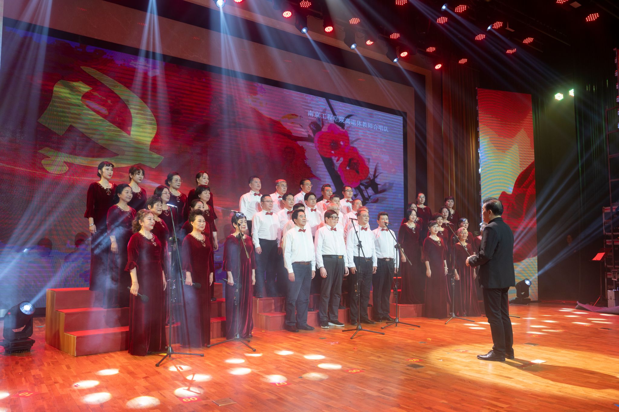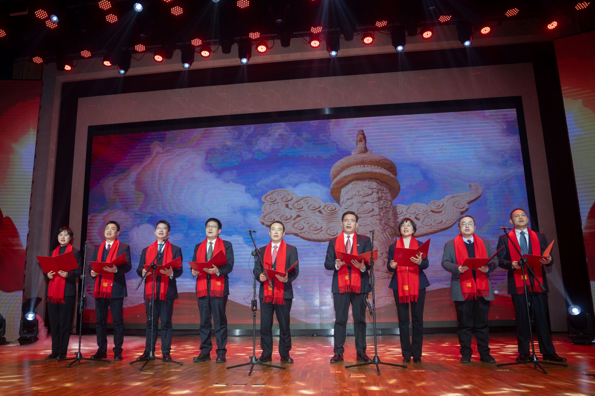 联欢会由“山河序曲”“东方华章”“矢志登峰”“同心筑梦”四个篇章组成。校领导班子带来小合唱《没有共产党就没有新中国》,歌声慷慨激昂,表达了对党的热爱和带领全校师生员工迈向美好未来的信心。
