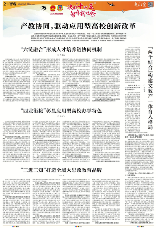 3月11日,《新华日报》“决胜十四五 智库新观察”专题版以《产教协同,驱动应用型高校创新改革》为题,整版刊发报道学校党委书记孙爱武,党委副书记、校长张仰飞,党委常委、副校长汪群、朱松青的系列署名文章,文章结合党的二十届三中全会精神和应用型高校发展实际,从“‘六链融合’形成人才培养链协同机制”“‘四业衔接’彰显应用型高校办学特色”“‘三进三知’打造全域大思政教育品牌”“‘两个结合’构建文教产一体育人格局”四个方面,深刻阐述了太阳集团产教融合、校地协同的特色发展之路,为更多应用型高校的教育教学改革贡献了“以党建联盟引领校地共建”“‘四业衔接’和‘六链融合’双向发力”的创新探索经验。
