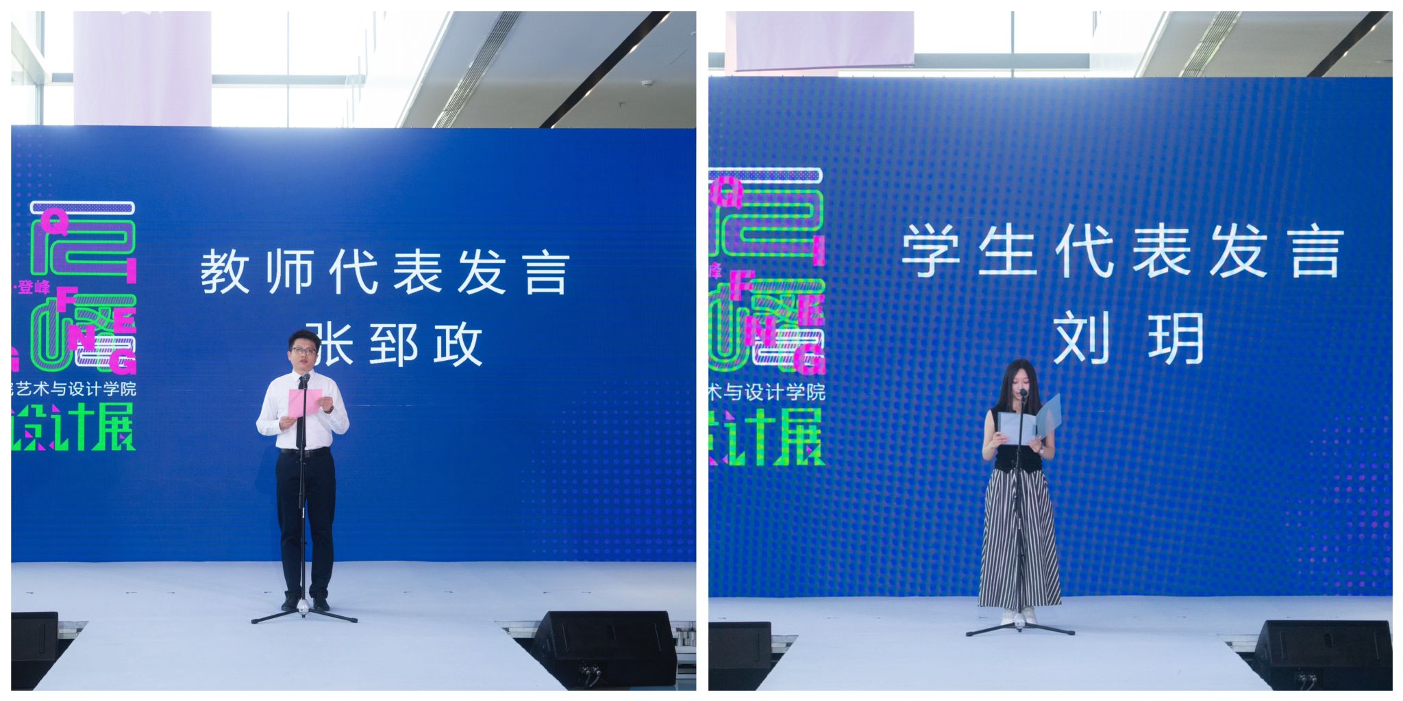 教师代表张郅政鼓励毕业生以“登峰”为人生目标,在时代浪潮中践行所学,同时表示母校永远是他们追梦路上的坚实后盾。学生代表刘玥表达了对母校与老师的感恩之情,动情地回顾了大学四年的美好时光,并以设计作品《无向度的人》为例,与参会师生共同探讨人工智能对人类自主性的影响。