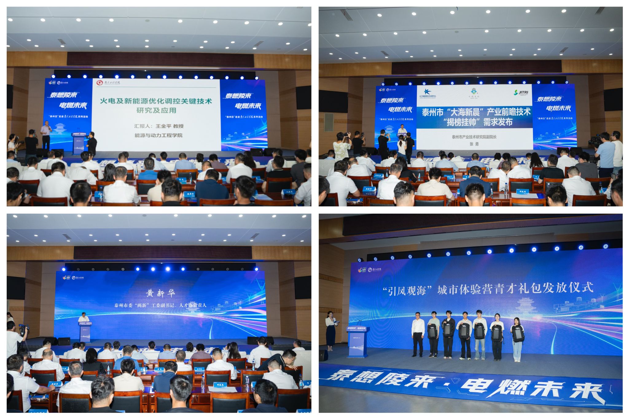 活动现场发布了泰州市“大海新晨”产业前瞻技术“揭榜挂帅”项目需求,推介了“泰有引力”青年人才政策,还举行了新能源、电子信息领域发展趋势和创新成果报告以及产业发展专家顾问聘任仪式,发布了“引凤观海”城市体验营活动,并为南工程学子发放青年人才礼包。