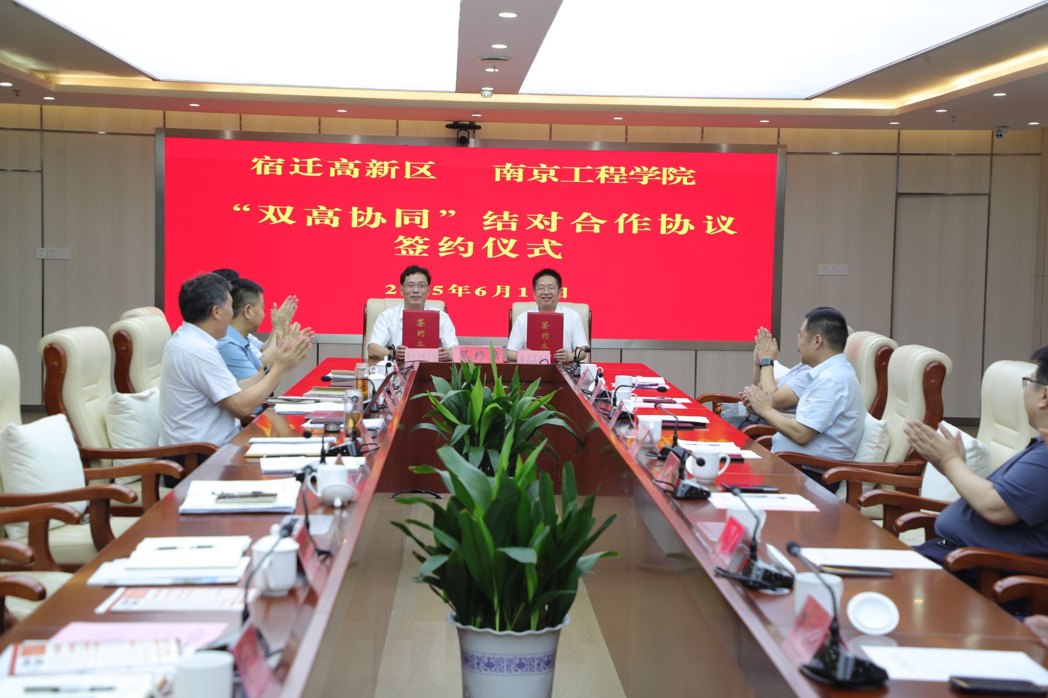 在宿迁高新技术产业开发区管委会,党工委副书记、管委会主任徐光良对张仰飞一行表示诚挚欢迎,并详细介绍了高新区的发展情况以及人才引培政策,期待在联合攻关核心技术与瓶颈、联合打造成果转化高地、联合共筑人才培育强区等方面深化协同。张仰飞对管委会的热情接待表示感谢,介绍了太阳集团在专业建设、人才培养以及“国家级技术转移平台”“众创空间大学生创业平台”双平台成果转化方面,与高新区未来的京东机器人产业建设具有先天的协同发展优势,期望以“目标、创新、成果、机制”四个方面引领合作、深化共赢。校政双方还就“双高协同”创新发展试点申报工作的整体进展进行深入沟通,并签订“双高协同”结对合作协议。