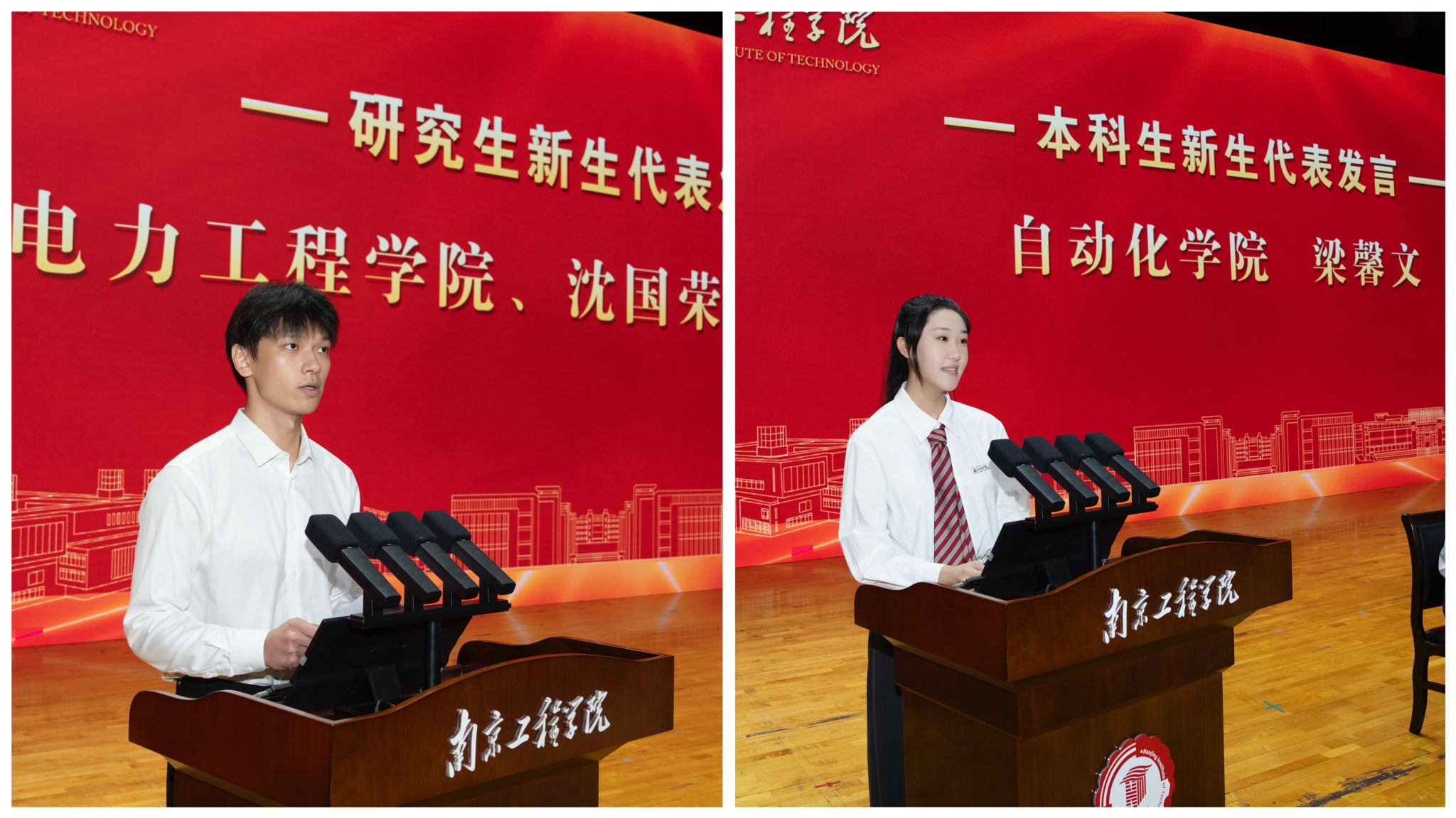 研究生新生代表、研625041班陆钧和本科生新生代表、自动化255班梁馨文分别发言,表达了对大学生活的期待与奋进决心。