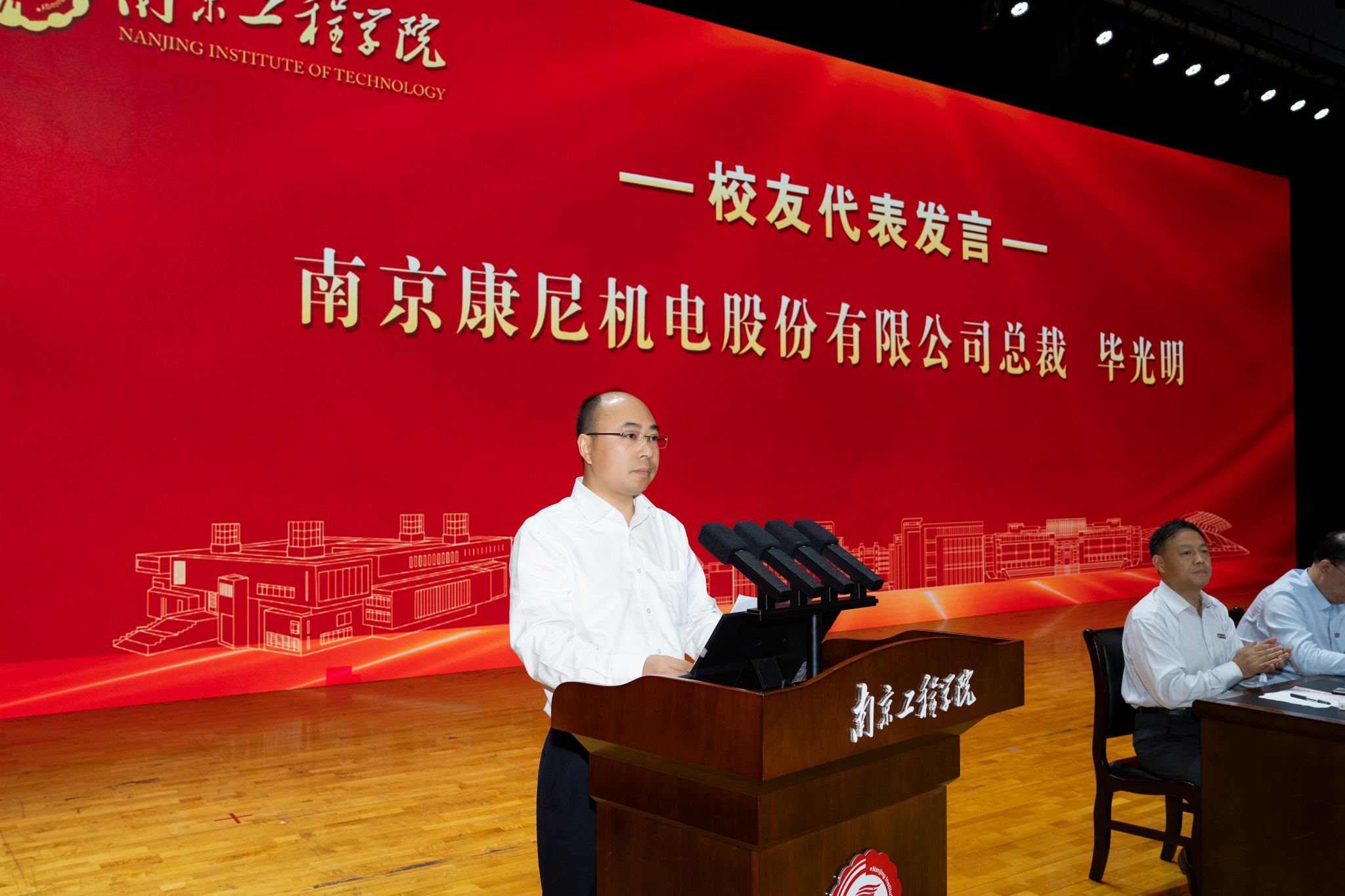 校友代表、康尼机电股份有限公司总裁、焊接951班毕光明追忆了在母校求学的美好时光,并结合自身学习和工作经历,勉励学弟学妹们在南工程校园里锻造主动探索的能力,锤炼勇于开拓的品质,践行勇于担当的使命。