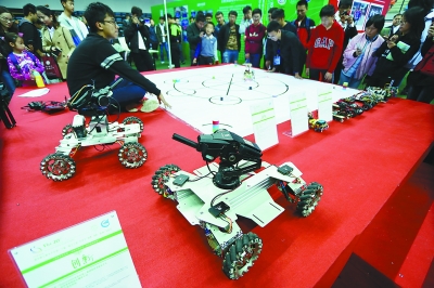 南京航空航天大学第二十届“航空工业”大学生“创意·创新·创业”上,一件件奇巧精致的创新作品被搬到了现场。图为一组可以分拣搬运的机器人,台中间的机器人在搜寻目标完成任务。 本报通讯员 楠航萱摄
