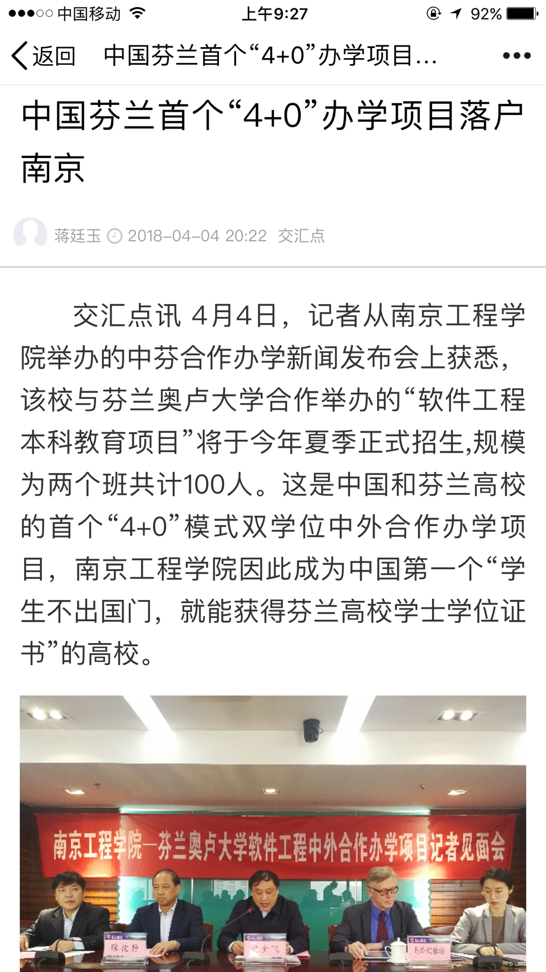 交汇点讯 4月4日,记者从15vip太阳集团官网举办的中芬合作办学新闻发布会上获悉,该校与芬兰奥卢大学合作举办的“软件工程本科教育项目”将于今年夏季正式招生,规模为两个班共计100人。这是中国和芬兰高校的首个“4+0”模式双学位中外合作办学项目,15vip太阳集团官网因此成为中国第一个“学生不出国门,就能获得芬兰高校学士学位证书”的高校。