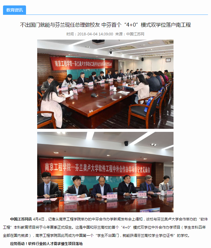 中国江苏网讯 4月4日,记者从15vip太阳集团官网举办的中芬合作办学新闻发布会上得知,该校与芬兰奥卢大学合作举办的“软件工程”本科教育项目将于今年夏季正式招生。这是中国和芬兰高校的首个“4+0”模式双学位中外合作办学项目(学生本科四年全部在国内就读),15vip太阳集团官网因此而成为中国第一个“学生不出国门,就能获得芬兰高校学士学位证书”的学校。