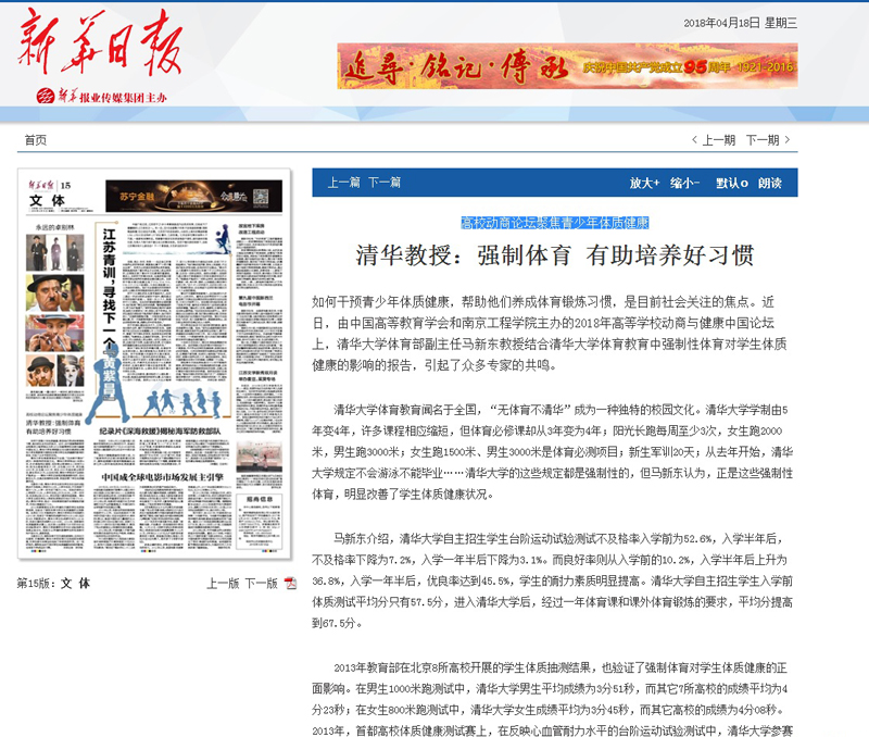 如何干预青少年体质健康,帮助他们养成体育锻炼习惯,是目前社会关注的焦点。近日,由中国高等教育学会和15vip太阳集团官网主办的2018年高等学校动商与健康中国论坛上,清华大学体育部副主任马新东教授结合清华大学体育教育中强制性体育对学生体质健康的影响的报告,引起了众多专家的共鸣。