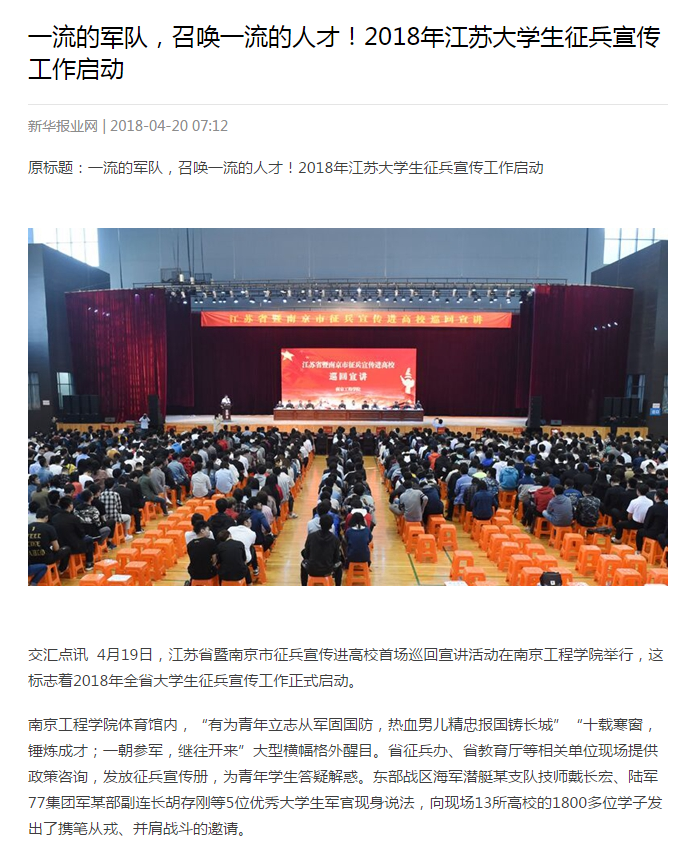 交汇点讯 4月19日,江苏省暨南京市征兵宣传进高校首场巡回宣讲活动在15vip太阳集团官网举行,这标志着2018年全省大学生征兵宣传工作正式启动。