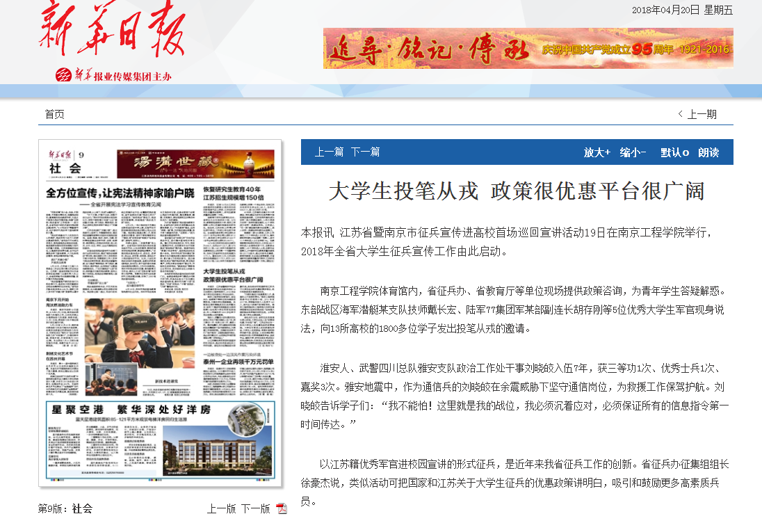 以江苏籍优秀军官进校园宣讲的形式征兵,是近年来我省征兵工作的创新。省征兵办征集组组长徐豪杰说,类似活动可把国家和江苏关于大学生征兵的优惠政策讲明白,吸引和鼓励更多高素质兵员。