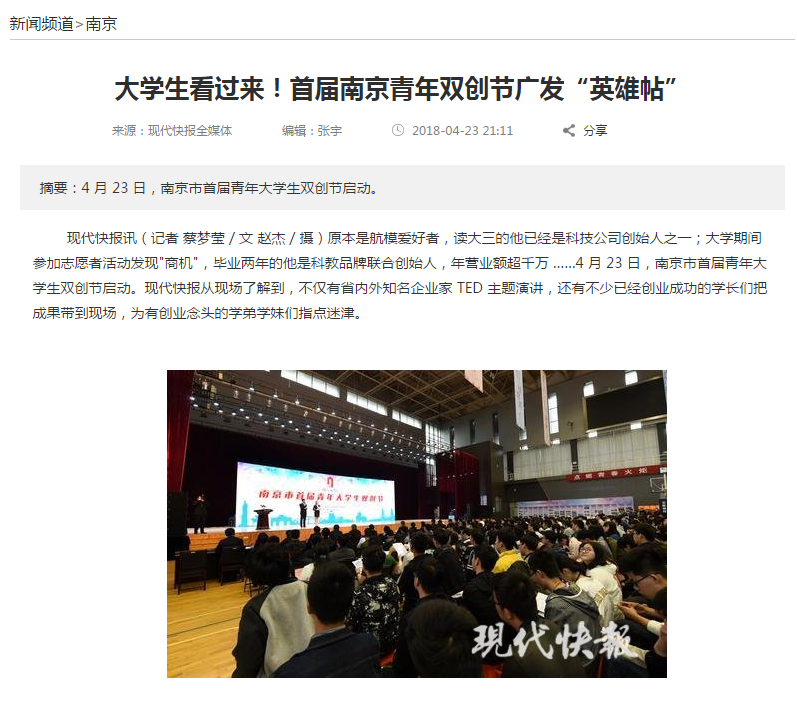 现代快报讯(记者 蔡梦莹 / 文 赵杰 / 摄)原本是航模爱好者,读大三的他已经是科技公司创始人之一;大学期间参加志愿者活动发现"商机",毕业两年的他是科教品牌联合创始人,年营业额超千万 ……4 月 23 日,南京市首届青年大学生双创节启动。现代快报从现场了解到,不仅有省内外知名企业家 TED 主题演讲,还有不少已经创业成功的学长们把成果带到现场,为有创业念头的学弟学妹们指点迷津。