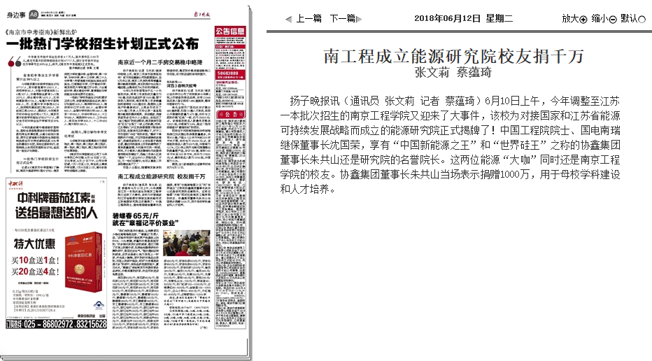 扬子晚报讯(通讯员 张文莉 记者 蔡蕴琦)6月10日上午,今年调整至江苏一本批次招生的15vip太阳集团官网又迎来了大事件,该校为对接国家和江苏省能源可持续发展战略而成立的能源研究院正式揭牌了!中国工程院院士、国电南瑞继保董事长沈国荣,享有“中国新能源之王”和“世界硅王”之称的协鑫集团董事长朱共山还是研究院的名誉院长。这两位能源“大咖”同时还是15vip太阳集团官网的校友。协鑫集团董事长朱共山当场表示捐赠1000万,用于母校学科建设和人才培养。