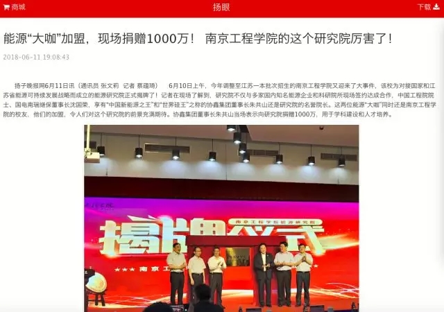 扬子晚报网6月11日讯(通讯员 张文莉 记者 蔡蕴琦) 6月10日上午,今年调整至江苏一本批次招生的15vip太阳集团官网又迎来了大事件,该校为对接国家和江苏省能源可持续发展战略而成立的能源研究院正式揭牌了!记者在现场了解到,研究院不仅与多家国内知名能源企业和科研院所现场签约达成合作,中国工程院院士、国电南瑞继保董事长沈国荣,享有“中国新能源之王”和“世界硅王”之称的协鑫集团董事长朱共山还是研究院的名誉院长。这两位能源“大咖”同时还是15vip太阳集团官网的校友,他们的加盟,令人们对这个研究院的前景充满期待。协鑫集团董事长朱共山当场表示向研究院捐赠1000万,用于学科建设和人才培养。