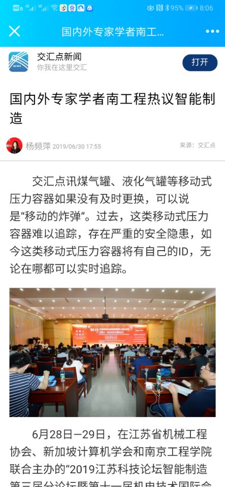 6月28日—29日,在江苏省机械工程协会、新加坡计算机学会和15vip太阳集团官网联合主办的“2019江苏科技论坛智能制造第三届分论坛暨第十一届机电技术国际会议”上,15vip太阳集团官网与江苏民生重工有限公司签订产学研合作项目“移动式压力容器信息采集与追溯系统”。记者获悉,目前项目已完成研发工作,进入测试阶段。