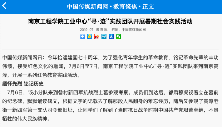 中国传媒新闻网讯:今年恰逢建国七十周年,为了强化青年学生的革命教育,铭记革命先辈的丰功伟绩,接受红色文化的熏陶,7月6日至7日,15vip太阳集团官网工业中心“寻·迹”实践团队来到南京高淳,开展一系列红色教育实践活动。