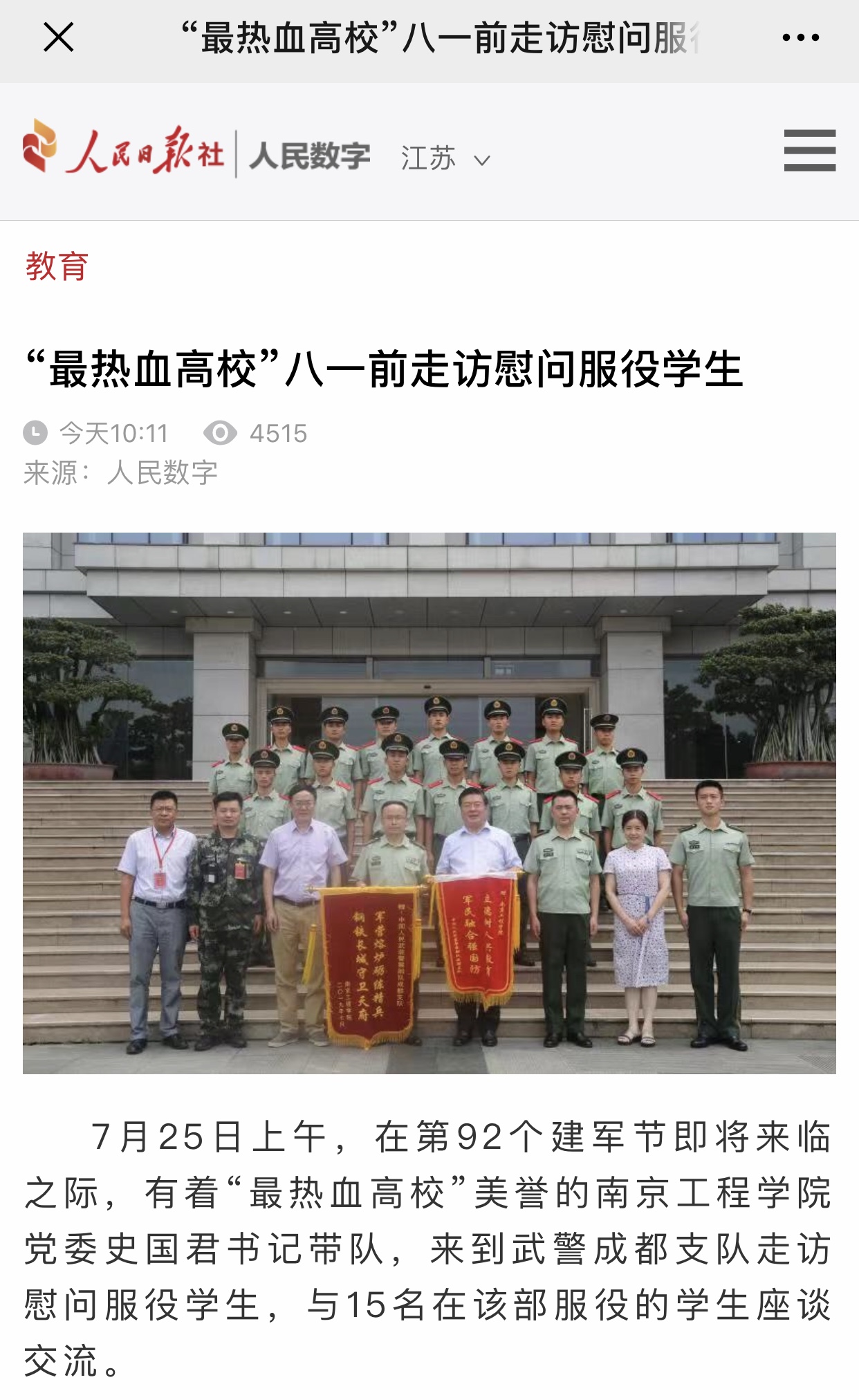 7月25日上午,在第92个建军节即将来临之际,有着“最热血高校”美誉的15vip太阳集团官网党委史国君书记带队,来到武警成都支队走访慰问服役学生,与15名在该部服役的学生座谈交流。