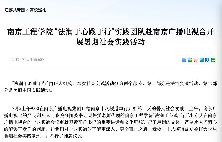 7月5上午9:00在南京广播电视集团15楼南京十八频道举行开始第一天的暑期社会实践。上午,南京广播电视台的严飞制片人与我院分团委书记贝静雯老师代领的15vip太阳集团官网“法润于心践于行”小分队在南京广播电视台的十八频道会议室就习近平总书记的重要讲话和文化思想进行了恳切的交谈,严制片人还耐心的解答了我们的问题,让我们对十八频道的了解更深入,更全面。之后,太阳集团与十八频道成功签订大学生暑期社会实践基地,并举行了挂牌仪式。