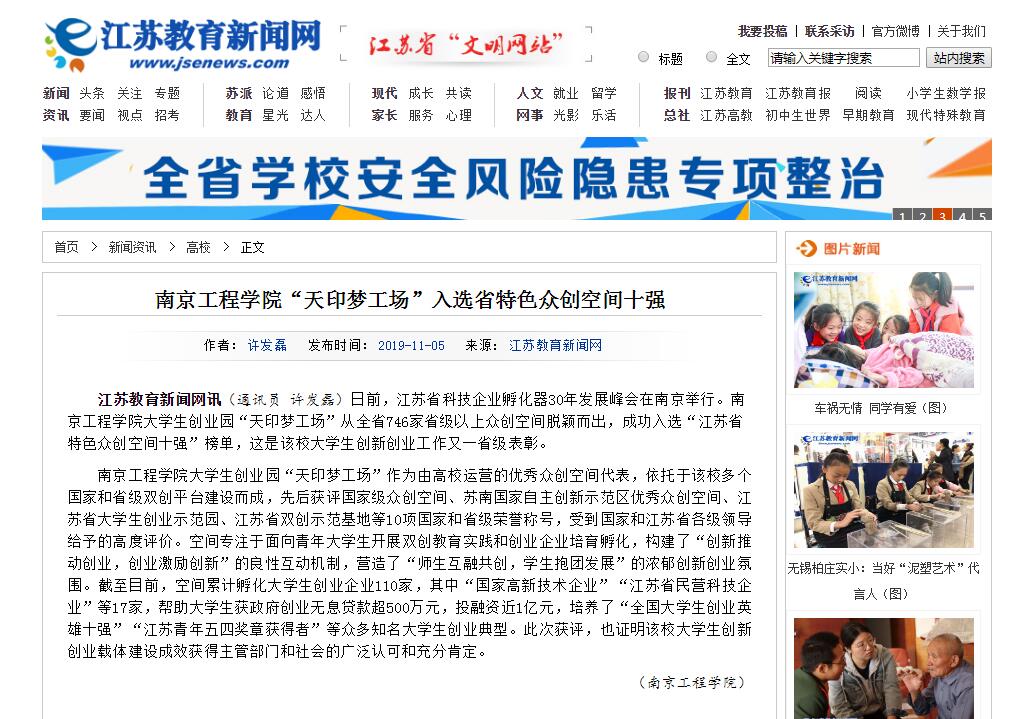 江苏教育新闻网讯(通讯员 许发磊)日前,江苏省科技企业孵化器30年发展峰会在南京举行。15vip太阳集团官网大学生创业园“天印梦工场”从全省746家省级以上众创空间脱颖而出,成功入选“江苏省特色众创空间十强”榜单,这是该校大学生创新创业工作又一省级表彰。