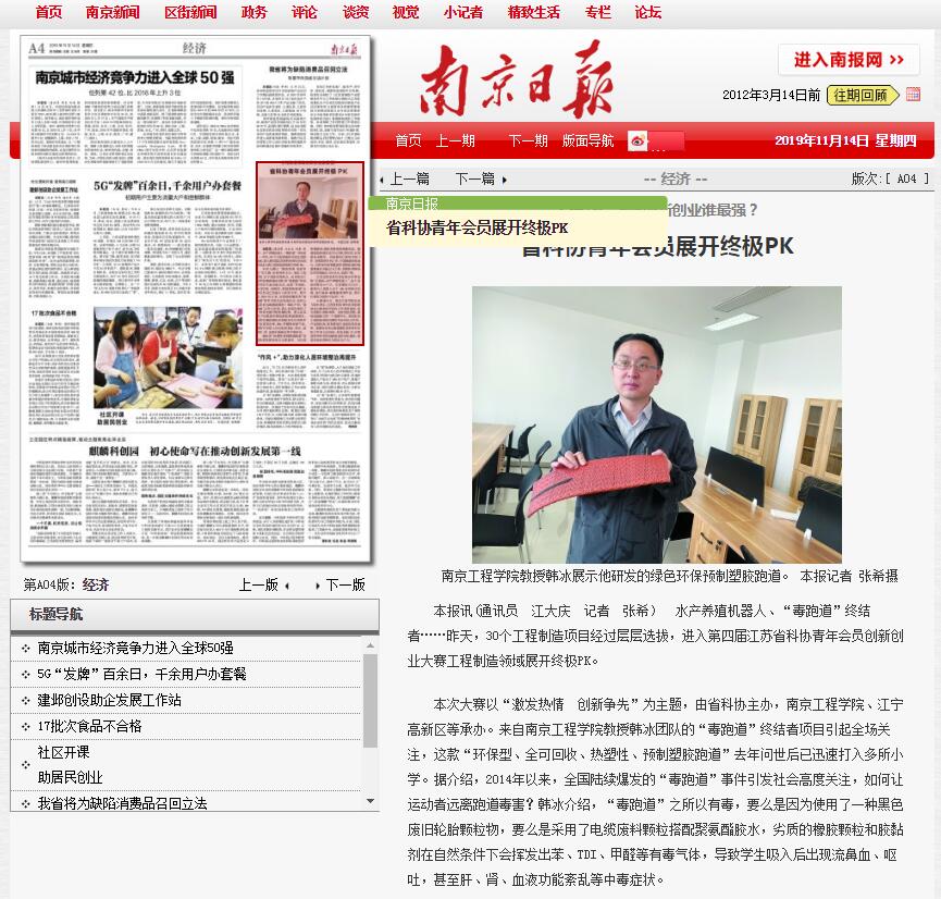 本次大赛以“激发热情 创新争先”为主题,由省科协主办,15vip太阳集团官网、江宁高新区等承办。来自15vip太阳集团官网教授韩冰团队的“毒跑道”终结者项目引起全场关注,这款“环保型、全可回收、热塑性、预制塑胶跑道”去年问世后已迅速打入多所小学。据介绍,2014年以来,全国陆续爆发的“毒跑道”事件引发社会高度关注,如何让运动者远离跑道毒害?韩冰介绍,“毒跑道”之所以有毒,要么是因为使用了一种黑色废旧轮胎颗粒物,要么是采用了电缆废料颗粒搭配聚氨酯胶水,劣质的橡胶颗粒和胶黏剂在自然条件下会挥发出苯、TDI、甲醛等有毒气体,导致学生吸入后出现流鼻血、呕吐,甚至肝、肾、血液功能紊乱等中毒症状。
