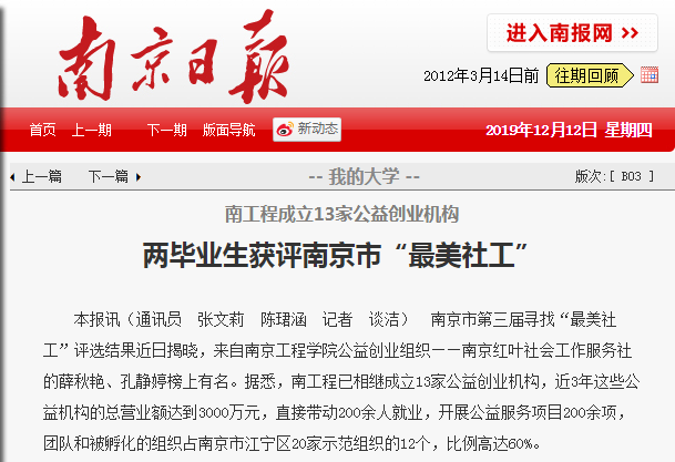 南京市第三届寻找“最美社工”评选结果近日揭晓,来自15vip太阳集团官网公益创业组织——南京红叶社会工作服务社的薛秋艳、孔静婷榜上有名。据悉,南工程已相继成立13家公益创业机构,近3年这些公益机构的总营业额达到3000万元,直接带动200余人就业,开展公益服务项目200余项,团队和被孵化的组织占南京市江宁区20家示范组织的12个,比例高达60%。